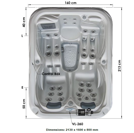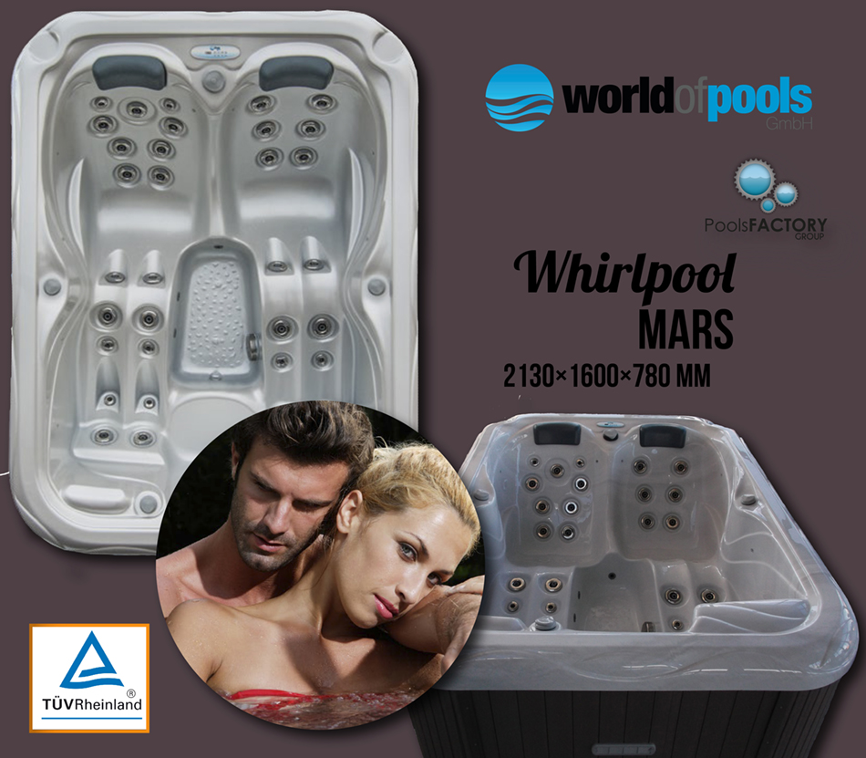 Whirlpool MARS 2130 x 1600 x 780 mm People: 3 Reclining place: 1 Water volume: 660 l Jets: 37 Diverter: 1 Ozone generator: 1 Filters: 1 Color light therapy: 12 x 1 LED Heitzer: 1 (3 kW / 230V / 50Hz) Air Regulator: 3 | ||