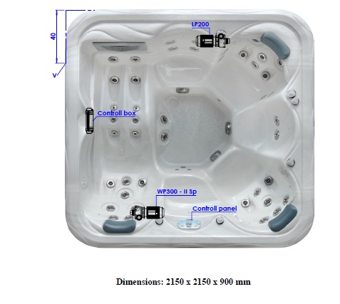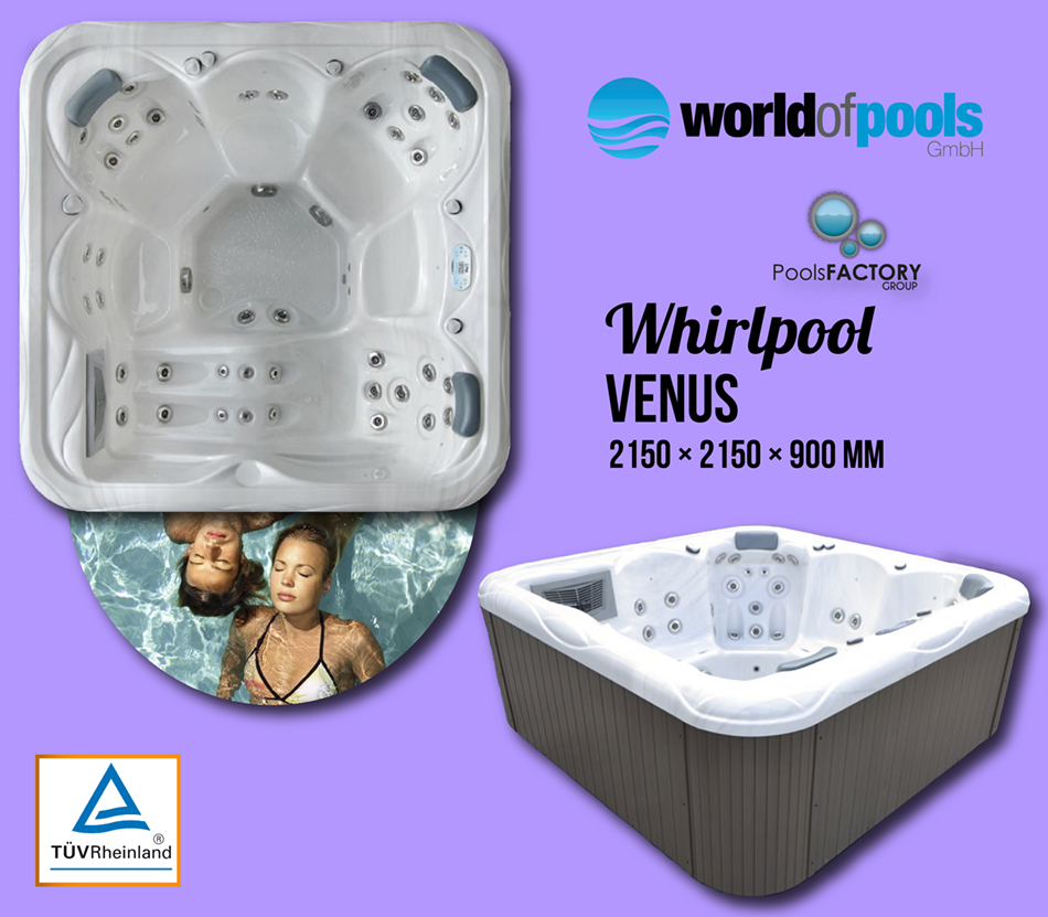 Whirlpool VENUS 2150 x 2150 x 900 mm People: 6 Reclining place: 1 Water volume: 1450 l Jets: 49 Diverter: 1 Ozone generator: 1 Filters: 2 Color light therapy: 18 x 1 LED Heitzer: 1 (3 kW / 230V / 50Hz) Air Regulator: 4 | ||